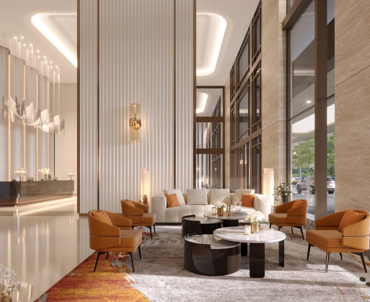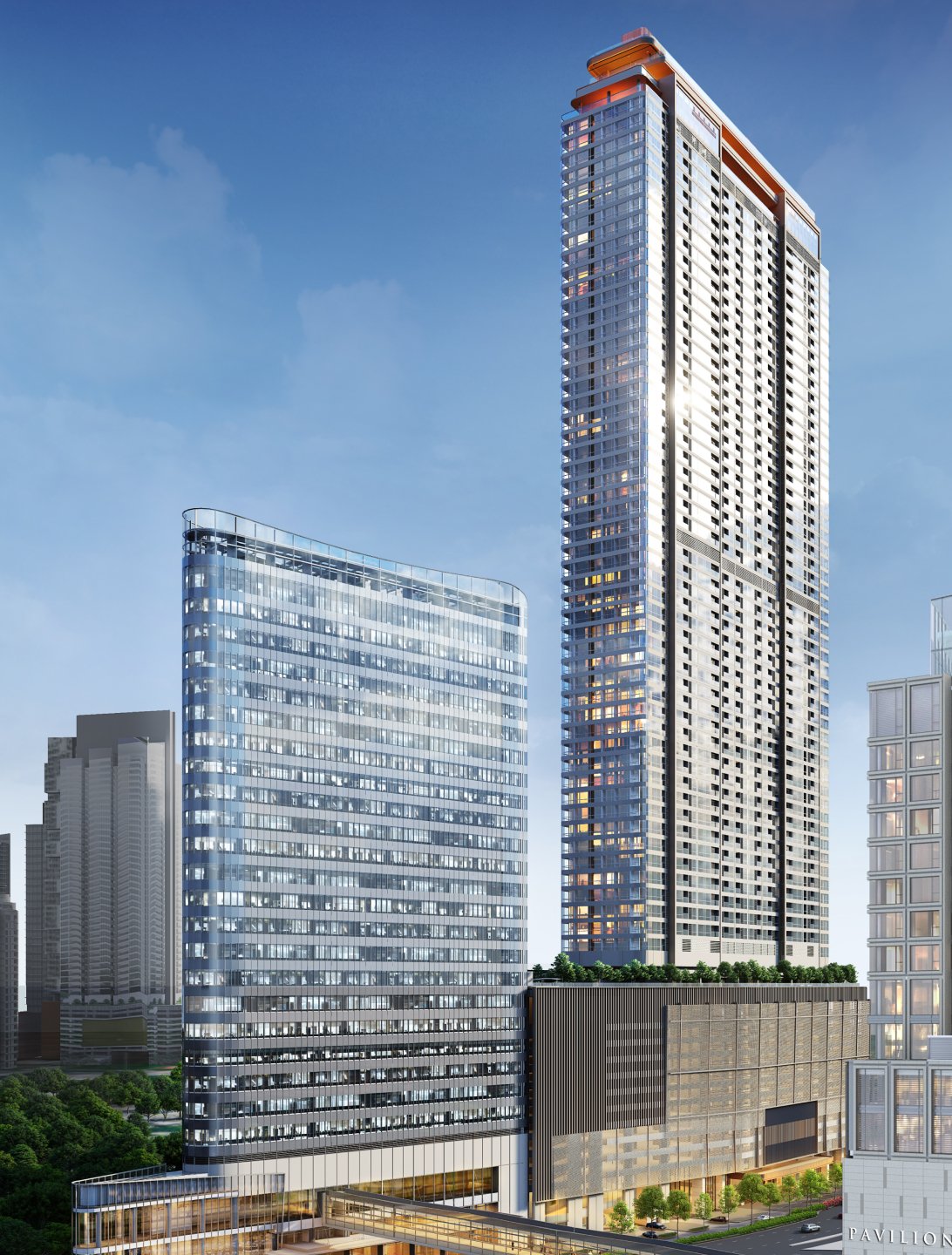 The iconic residential tower of Pavilion Square rises with elegance, embodying both grandeur and timeless sophistication.