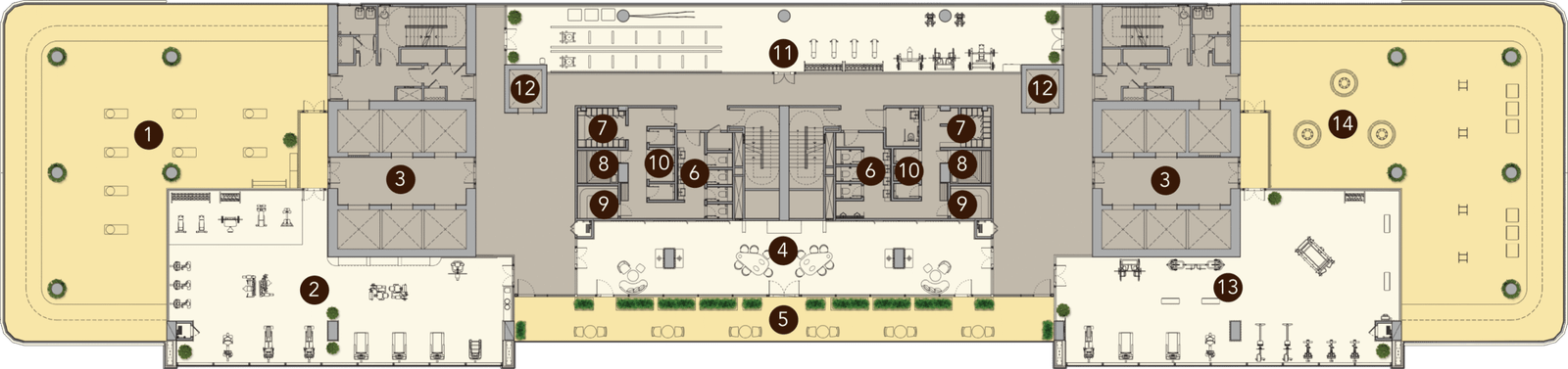 Spanning 15,000 sq. ft. on Level 63A, Pavilion Square elevates wellness above the city. Train in a fully equipped indoor and outdoor gym featuring premium fitness brands, then complete your routine with steam, sauna, and a rejuvenating Sports Lounge experience.